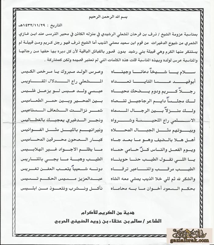 قصيدة الشاعر القدير سالم بن عتقاء الحربي التي شارك بها بحفل زواج فرحان بن ذرف المشعلي