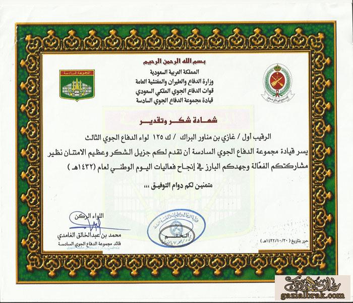 رد: شهادة شكر وتقدير للشاعر غازي البراك من مجموعة الدفاع الجوي السادسه