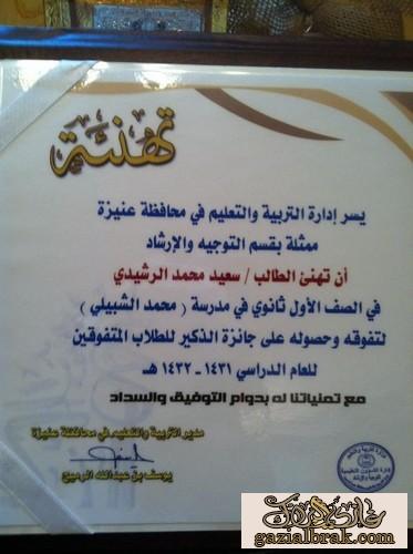 رد: لوحة الشرف الأولي لأبناء بني رشيد الدكتور مراد عوض ابراهيم الذيابي  طالب في كلية طب الاسنان في جامعة القصيم ومن المتفوقين علي مستوي المملكه وبسببه حصلت جامعة القصيم على المركز الأول للطلاب والطالبات على مستوى المملكة العربية السعودية وذلك بعد فوز الطالب مراد عوض الرشيدي من طلاب كلية طب الأسنان بالريشة الذهبية في المحور الصحي كجائزة لأفضل طالب متميز في البحث كما حصل على المركز الثاني في الملتقى الطلابي الإبداعي الرابع عشر، الذي عُقد بجامعة الإسكندرية عن بحث بعنوان "معوقات البحث العلمي في الوطن العربي وهنا تقرير القناه السعوديه عنه http://www.youtube.com/watch?feature...&v=ZAZJvwdMMCI |