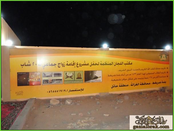 نيابة عن صاحب السمو الملكي الأمير عبد العزيز بن سعد آل سعود نائب أمير منطقة حائل رعى سعادة محافظ الغزالة الأستاذ تركي بن شفاقة العتيبي، مساء يوم الأحد 4/8/1433هـ حفل الزواج الجماعي لعشرين شاب وشابه بمركزضريغط بالاضافة إلى مساعدة 124يتيما وتكريم حفظة كتاب الله بدعم من رجل الأعمال الشيخ عبدالله بن عبيد العويمري الرشيدي وبحضور مدير عام الشؤون الاجتماعية بحائل الأستاذ سالم السبهان وعددا من رؤساء المراكز والإدارات الحكومية والمجالس البلدية ومعرفو القرى ووجهاء وأعيان البلدة . القي حفل خطابي بمقدمة الزميل عبيد الله عبيد وتوالت قصائد شعرية واوبريت التوحيد بهذه المناسبة بعد ذلك تكريم الجهات المشاركة. وقد بدي الحفل بالقرآن الكريم ثم القى نائب راعي الحفل محافظ الغزالة الاستاذ/ تركي بن شفاقة العتيبي كلمة قال فيها : لقد شرفني صاحب السمو الملكي نائب أمير منطقة حائل حفظه الله بان أرعى هذا الحفل نيابة عن سموه وانقل لإخواني المتزوجين تهانيه وتبريكاته وتمنياته لهم بحياة زوجيه سعيدة ,وكذلك شكر سموه الكريم للأخ عبدالله العويمري على جهوده في هذه المناسبة فما هذه التكاليف الا نابع من اهتمام ولاة الأمر حفظهم الله بأبنائهم وبناتهم ولما تبذله حكومتنا الرشيدة بقيادة خادم الحرمين الشريفين الملك عبد الله بن عبد العزيز و ولي عهده الأمين حفظهما الله من جهود لتذليل الصعاب وما يوليه وبصفه خاصة سيدي صاحب السمو الملكي الأمير سعود بن عبدالمحسن آل سعود أمير منطقة حائل وسمو نائبه حفظهم الله من اهتمام الأعمال الخيرية التكاليف والاجتماعية بوجه عام بالمنطقة فتزويج الشباب ورعايتهما والبذل فيها عمل شريف لما يحققه من فوائد عظيمة وطمائنينه واستقرار اجتماعي واسري فهذه الجمع الطيب ثمره جهود كبيرة من الجميع . ثم كلمة الداعم الشيخ عبدالله بن عبيد العويمري الرشيدي : قائلا فخورين بتتويج هذه الجهود الخيرية والذي شرفها المحافظ العتيبي نيابة عن سمو نائب أمير منطقة حائل سائلين المولى عز وجل ان يوفق هؤلاء الشباب لما فيه الخير مقدما شكره لسمو أمير المنطقة وسمو نائبه وسعادة المحافظ متمنيا ان يعين الجميع على خدمة والوطن والدين والمجتمع تحت ضل ورعاية خادم الحرمين الشريفين و ولي عهده الأمين مقدما شكره لبلدية انبوان على مساهمتها الفعالة في إنجاح الحفل. ثم القلا رئيس مركز إمارة ضريغط الأستاذ نايف البراك كلمة بهذه المناسبة عبر فيها عن فرحته الغامرة في مناسبة زفاف عشرين شابا وشابه جنوب منطقة حائل لدخولهم القفص الذهبي لإكمالهم نصف دينهم داعين المولى عز وجل أن يوفقهم وتمنى لهم حياة سعيدة وأضاف كونها المرة الأولى من نوعها جنوب حائل نتمنى أن تستمر كل عام . وقال مدير عام الشؤون الاجتماعية بمنطقة حائل الاستاذ/ عبدالكريم السبهان ان هذا العمل الجليل يأتي امتدادا لما تبذله حكومتنا الرشيدة تحت ظل رعاية خادم الحرمين الشريفين أطال الله بعمره واستطرد ماريناه الليلة نموذج من الأعمال الخيرية مقدما شكره لسمو أمير المنطقة وسمو نائبه و سعادة المحافظ موصولا الشكر للداعم العويمري الذي بذل جهدا جنينا ثماره هذه الليلة. الصور ومقاطع الفيديوا القران الكريم القارئ / سلمان فهد البراك مقدم الحفل الاستاذ عبيدالله عبيد الرشيدي http://www.youtube.com/watch?v=zRGgTMgfRuY محافظ الغزاله الاستاذ تركي العتيبي كلمة رئيس مركز قرية الظريغط كلمة صاحب الحفل http://www.youtube.com/watch?v=4vSXd...ature=youtu.be الشاعر مسلم بن سلمان العويمري http://www.youtube.com/watch?v=qdtwxPgaAgQ&feature=plcp الشاعر غازي البراك http://www.sot3bs.com/do.php?imgf=so...3407540121.jpg http://www.sot3bs.com/do.php?imgf=so...3407540122.jpg http://www.sot3bs.com/do.php?imgf=so...3407540123.jpg http://www.sot3bs.com/do.php?imgf=so...3407548977.jpg http://www.sot3bs.com/do.php?imgf=so...3407540124.jpg http://www.sot3bs.com/do.php?imgf=so...3407540125.jpg http://www.sot3bs.com/do.php?imgf=so...3407540126.jpg http://www.sot3bs.com/do.php?imgf=so...3407540127.jpg http://www.sot3bs.com/do.php?imgf=so...3407540128.jpg http://www.sot3bs.com/do.php?imgf=so...3407540129.jpg http://www.sot3bs.com/do.php?imgf=so...4075401210.jpg http://www.sot3bs.com/do.php?imgf=so...3407548961.jpg http://www.sot3bs.com/do.php?imgf=so...3407548962.jpg http://www.sot3bs.co