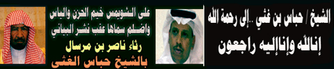 انتقل الى رحمة الله الشيخ حباس بن غثي وسوف يصلى عليه بعد صلاة الظهر لهذا اليوم الاحد 16//6 بجامع الملك خالد بأم الحمام بالرياض. انا لله وانا اليه راجعون  |